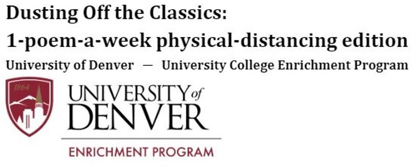 A brief word on logistics. Each week we'll get together via Zoom and "dust off" – by very closely reading, as well as examining the artistry of – a different short poem which itself in some sense dusts off the classics. I'll be posting links to the texts (as well as other information) so that you'll have a chance to read and think about each week's short poem ahead of time. Also, we will be making these Zoom sessions more secure by asking everyone to "register" for each series which will allow us to take advantage of the Zoom access features in DU's registration system.